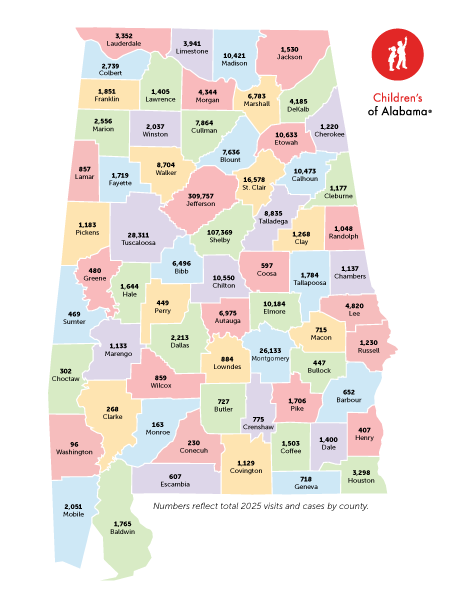 Since 1911, Children’s of Alabama has provided specialized medical care for ill and injured children. Ranked among the best children’s hospitals in the nation by U.S. News & World Report, Children’s serves patients from every county in Alabama and nearly every state. With more than 3.5 million square feet, it is one of the largest pediatric medical facilities in the United States. Children’s offers inpatient and outpatient services at its Russell Campus on Birmingham’s historic Southside with additional specialty services provided at Children’s South, Children's at Patriot Park Outpatient Center, and in Huntsville and Montgomery. Primary medical care is provided in more than a dozen communities across central Alabama. Children’s is the only health system in Alabama dedicated solely to the care and treatment of children. It is a private, not-for-profit medical center that serves as the teaching hospital for the University of Alabama at Birmingham (UAB) pediatric medicine, surgery, psychiatry, research and residency programs. The medical staff consists of UAB faculty and Children’s full-time physicians as well as private practicing community physicians. Children’s treats all children, regardless of their family’s ability to pay. Children’s believes in family-centered care and offers child life, social services, pastoral care and other programs to help meet patients’ unique needs.